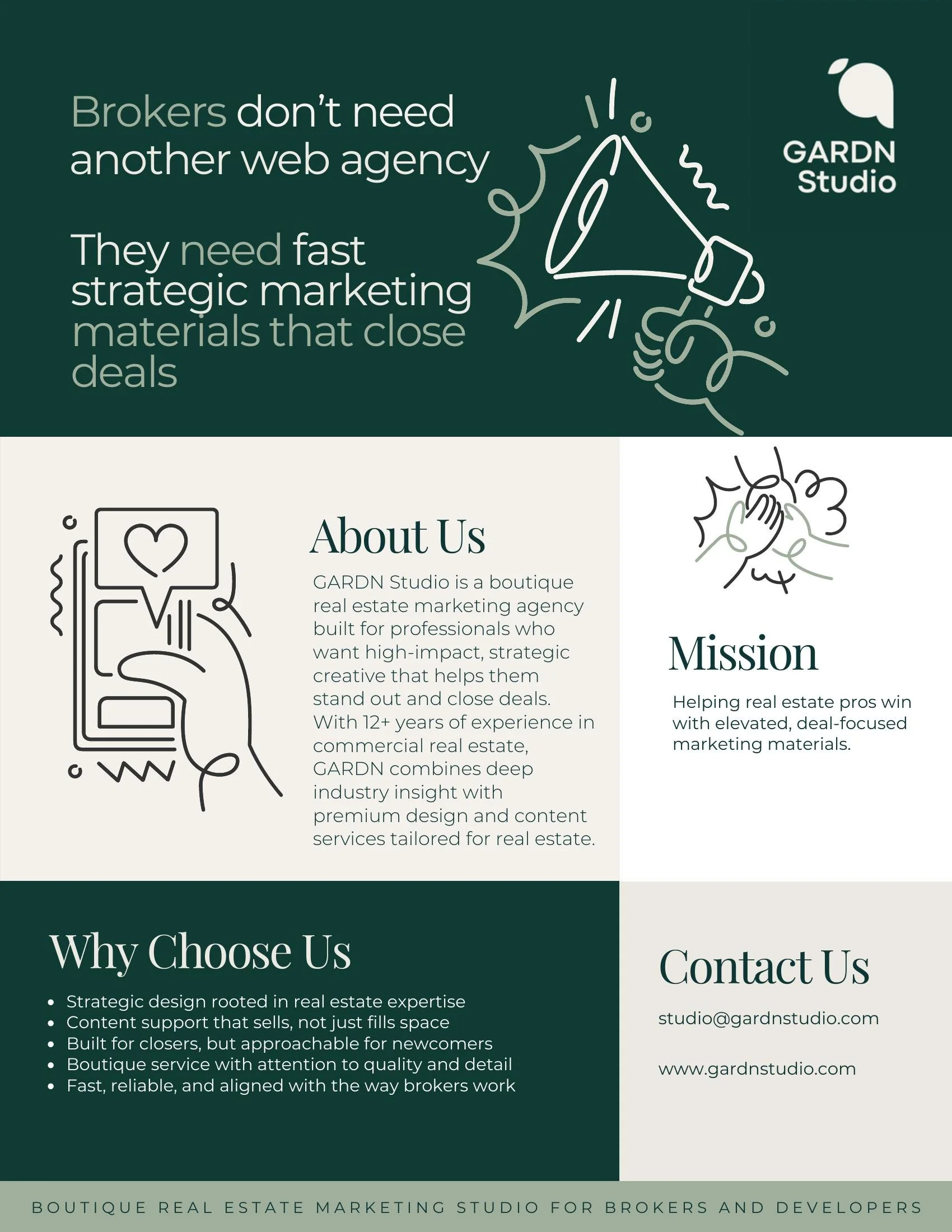 GARDN Studio is a boutique creative agency built exclusively for real estate. With 12+ years of experience working alongside top-producing brokers and emerging leaders across Canada and overseas, we know how to position properties — and agents — to win. From flyers and tourbooks to brochures and brand kits, we create powerful, polished marketing that helps you pitch, sell, and close faster.